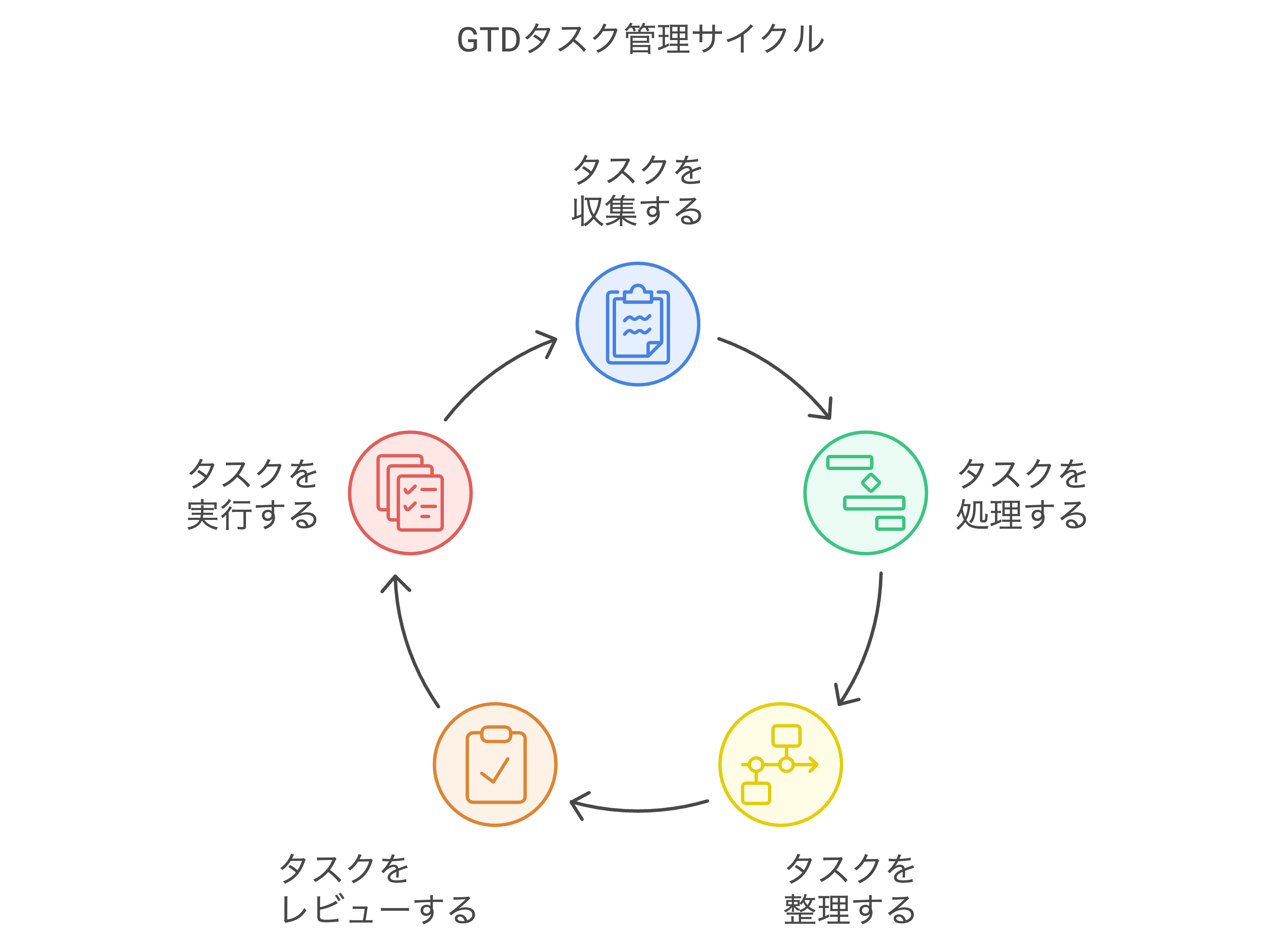 GTDは、次の5つのステップに基づいてタスクを管理する方法です。この方法を導入することで、タスク管理の負担を軽減し、効率的に業務を進めることができます。