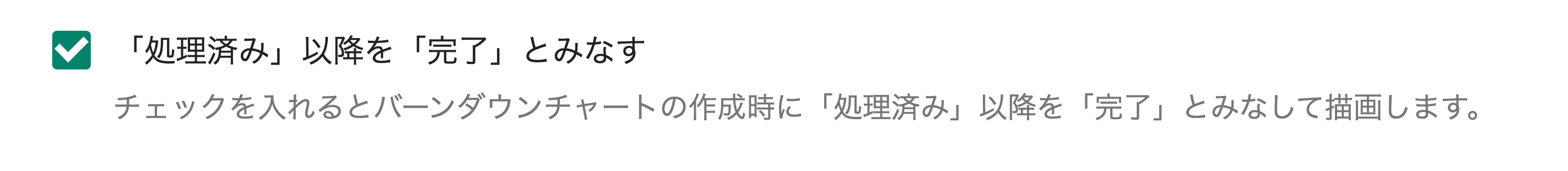 たとえば、Backlogでは「処理済み」と「完了」を見なして管理する機能がありますが、これは主にバーンダウンチャートを活用する場合に有効なオプションです。バーンダウンチャートを使わない、導入したてのユーザーやシンプルに管理をしたい場合には、この設定を意識する必要はありません。