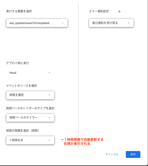 この処理をGASのトリガーという機能で、一定の時間間隔で実行するように設定します。以下では、1時間間隔で実行しています。
