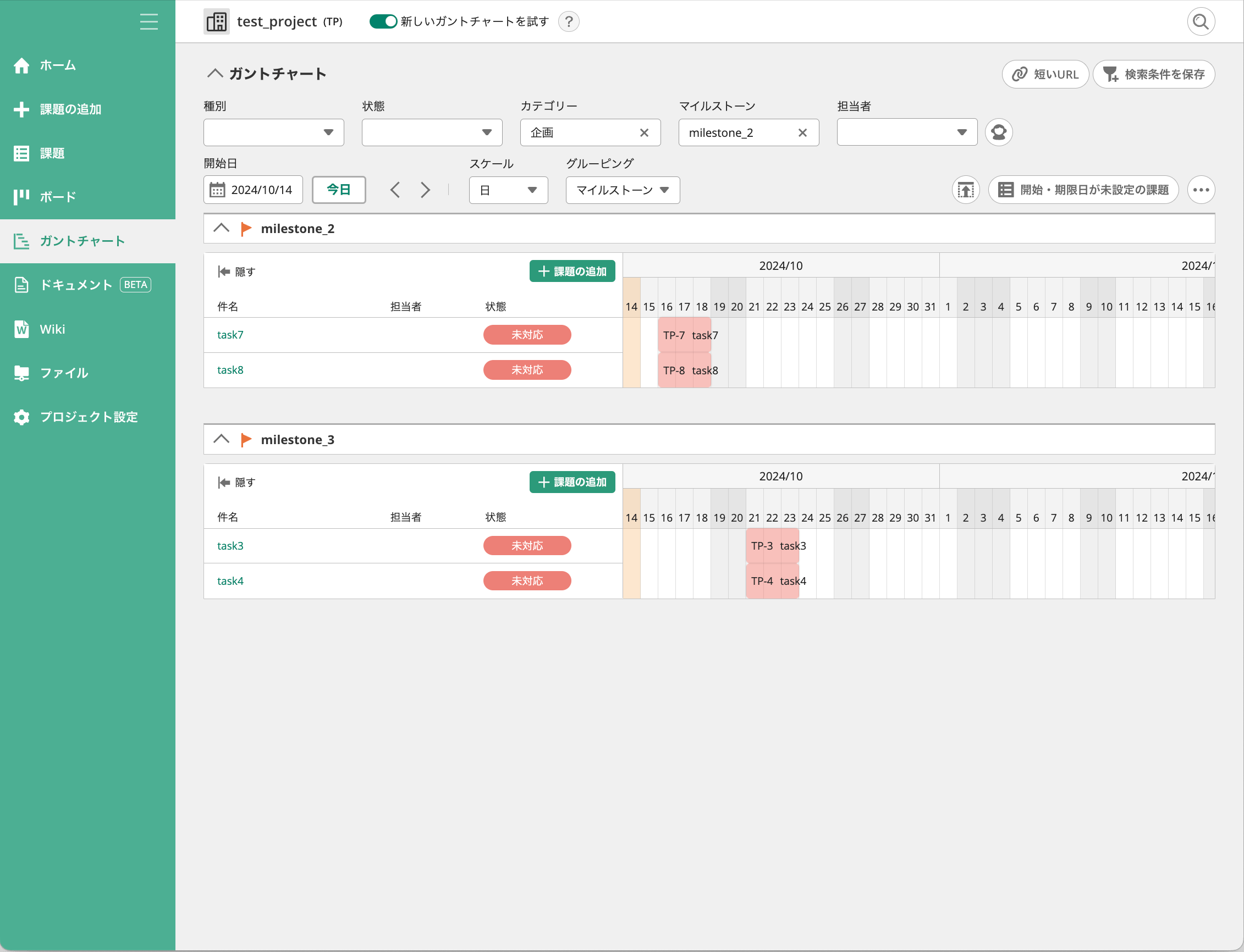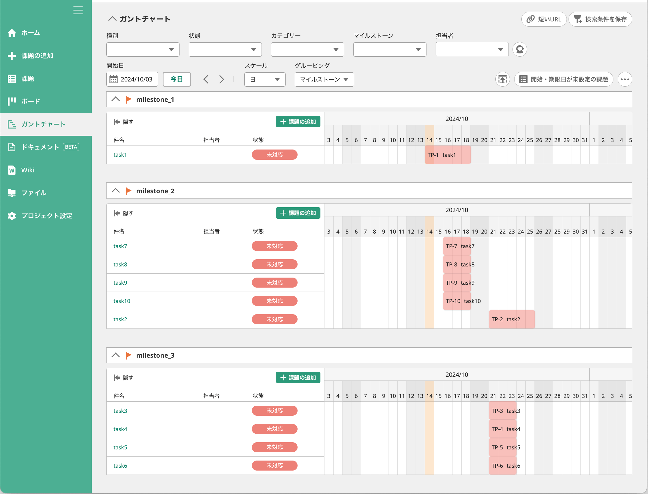 https://yourdomain.backlog.com/gantt/TP?span=6&scale=days&grouping=2&categoryId=1469361&categoryId=1469362&milestoneId=1066181&milestoneId=1066182categoryId=1469362 とmilestoneId=1066182 がそれぞれ、分析、milestone_3を表しています。このURLで表示されるガントチャートは以下です。