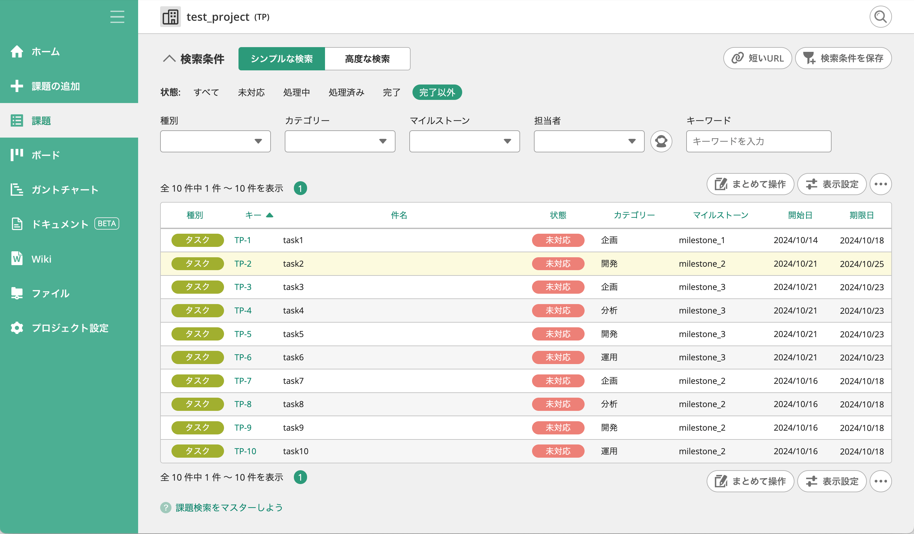 そうすると、マイルストーンに紐づいているすべてのタスクが表示されます。このマイルストーンには、企画部署や分析部署を想定して、他部署のタスクも紐づいています。そうすると、各部署で指定のマイルストーンに絞ったり、マイルストーンの中で複数指定のカテゴリーに絞ってみたいユースケースが出てくるはずです。